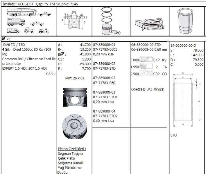 MOTOR PISTON SEGMAN 75,00MM STD 0,20 KISA PEUGEOT P206 P307 PARTNER II BERLINGO II CITROEN C4 C5 II P308 P3008 P5008 DV6 1,6HDI 16V FOCUS CMAX 1,6TDCI EURO 4 - GOETZE 8771783STD100G