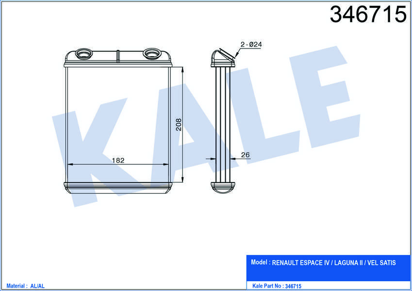 KALORIFER RADYATORU BRAZING RENAULT LAGUNA II 1.6/2.0 16V 1.9/2.0DCI 01-07 VEL SATIS 2.0/2.2DCI 02- ESPACE IV 2.0DCI 06- AC/NAC BRAZING AL/AL 20818226 - KALE 346715
