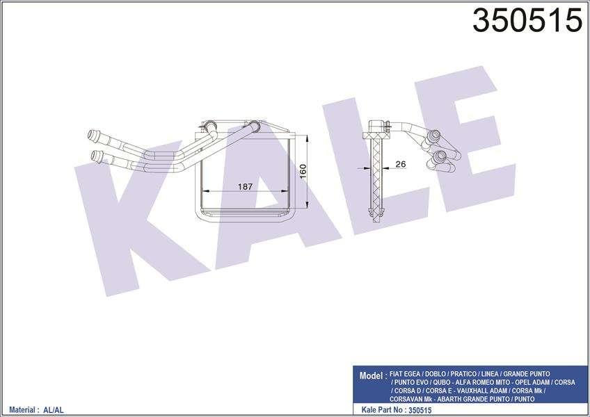 KALORIFER RADYATORU FIAT EGEA / DOBLO / PRATICO / LINEA / GRANDE PUNTO / PUNTO EVO / QUBO - ALFA ROMEO MITO - OPEL ADAM / COMBO / CORSA / CORSA D / CORSA E / MERIVA - CITROEN NEMO - VAUXHALL ADAM / CORSA MK / CORSAVAN MK - ABARTH GRANDE PUNTO / - KALE 350515