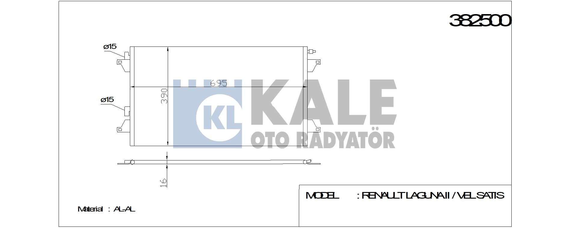KLIMA RADYATORU KONDENSER KURUTUCULU AL/AL RENAULT LAGUNA II 1.6 16V 01-05. 1.8-2.0 16V 01-07. 3.0 V6 24V 01-07. 1.9-2.2 DCI 01-07 700x391x16 - KALE 382500