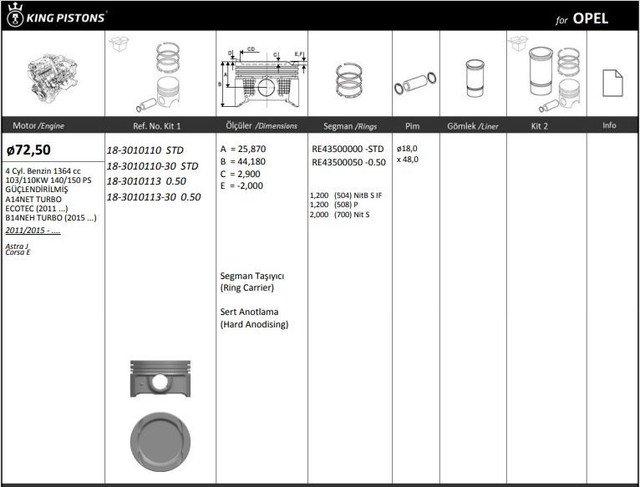 MOTOR PISTON+SEGMAN [ RIKEN ] 72.50 MM STD OPEL ASTRA J CORSA E 1.4 [ECOTEC] 11- A14NET B14NEH [GUCLENDIRILMIS] [0.30 KISA] - KINGPISTON 18-3010110-30