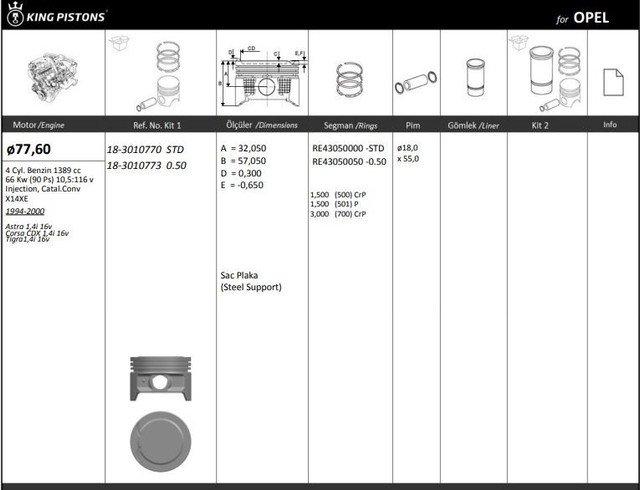 Motor Pistonsegmani Riken 77.60stdmm Cap Astra 1.4i 16v Corsa Cdx 1.4i 16v Tigra1.4i 16v X14xe 4 Sil.Benzinli 1389 Cc-66 Kw 90 Ps 10.5116 V-e - KINGPISTON 18-3010770