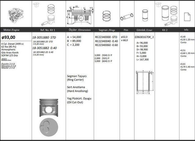 MOTOR PISTON SEGMAN RIKEN 93.00STD/0.20 KISA DUCATO 2.5D MOVANO 2.5D MASTER 2.5D SOFIM 2/5 2499CC - KINGPISTON 18-3051880-20
